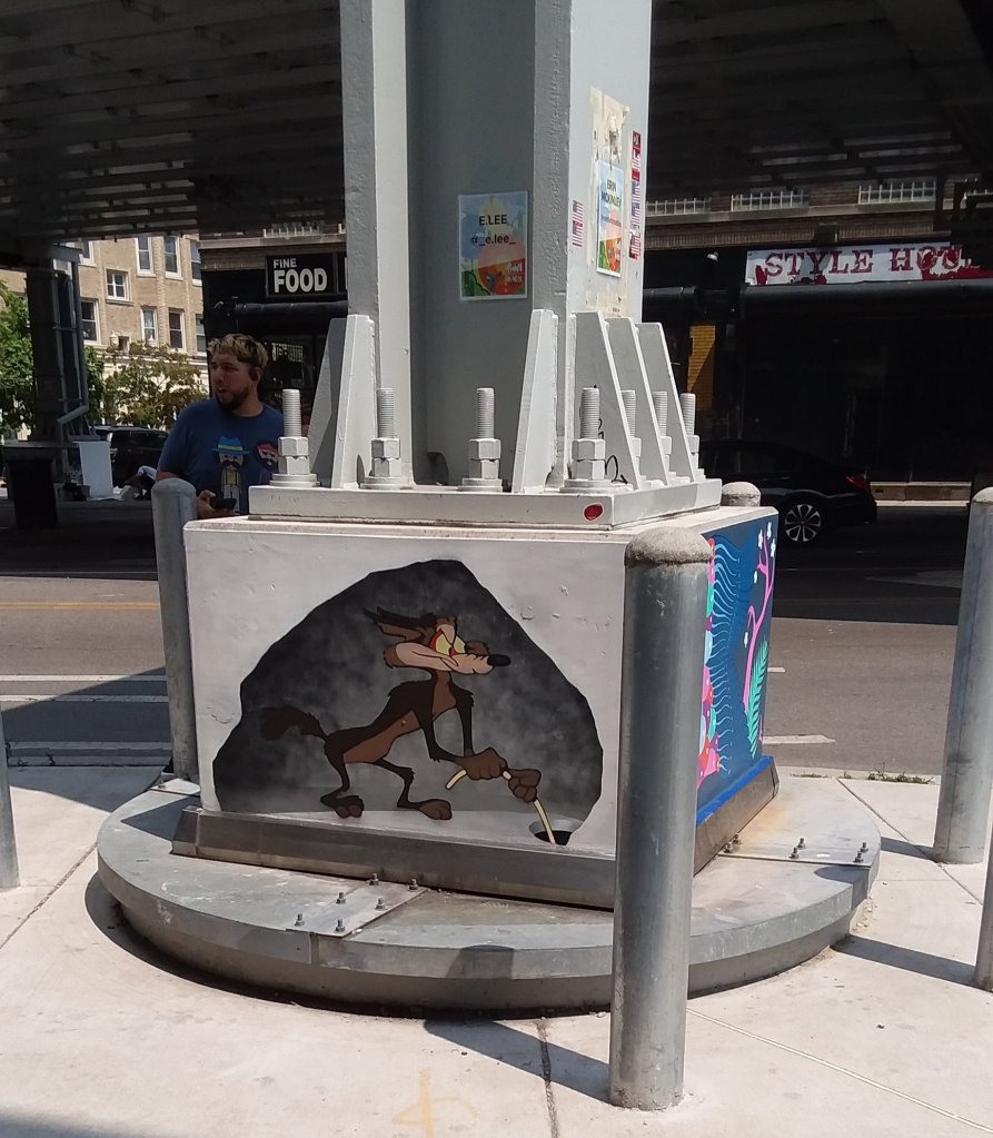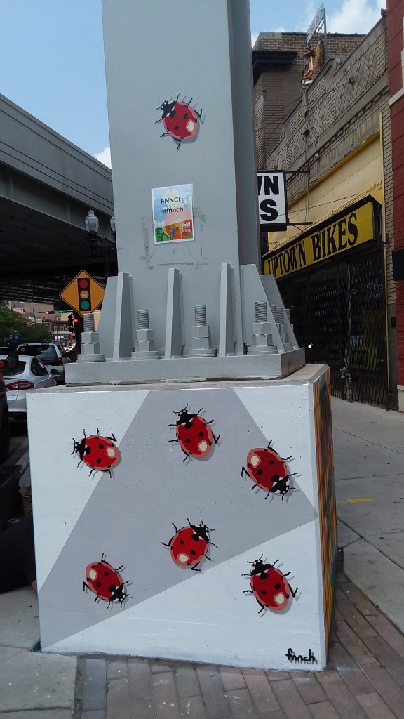 A Block Chicago article I found mentioned that one column would be painted by the “prolific and controversial Bay artist fnnch” so we made sure we found that one.