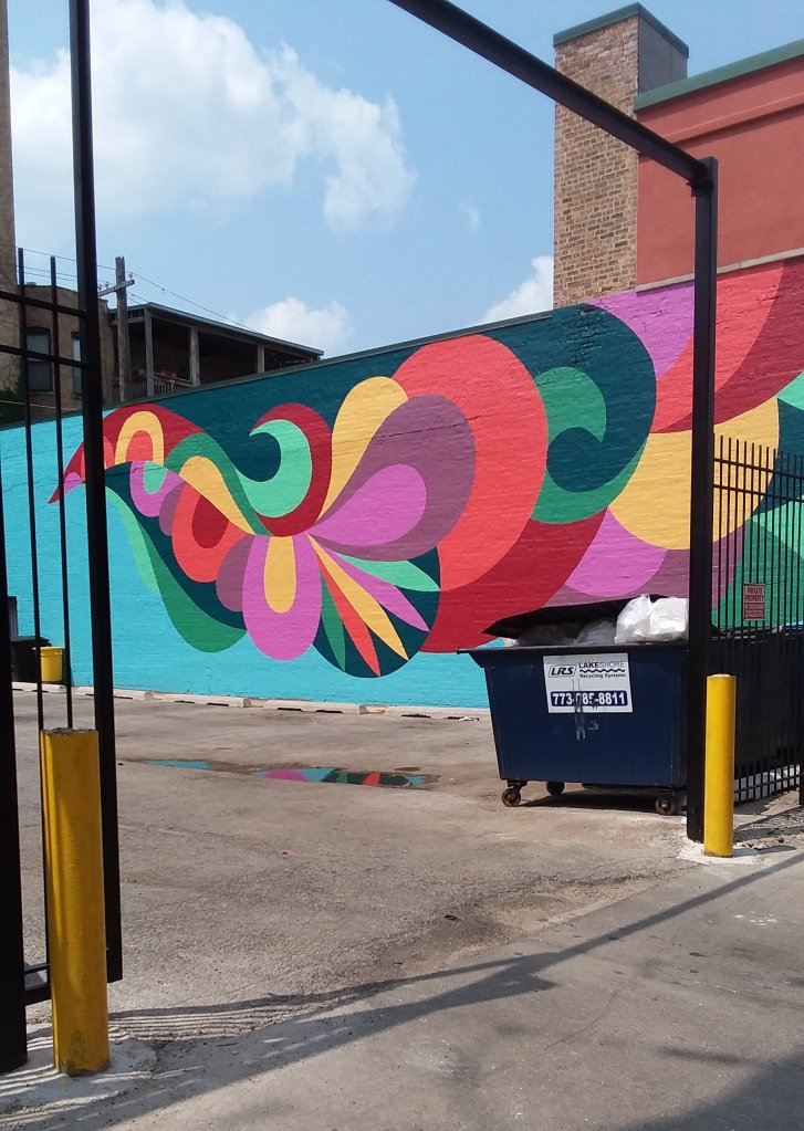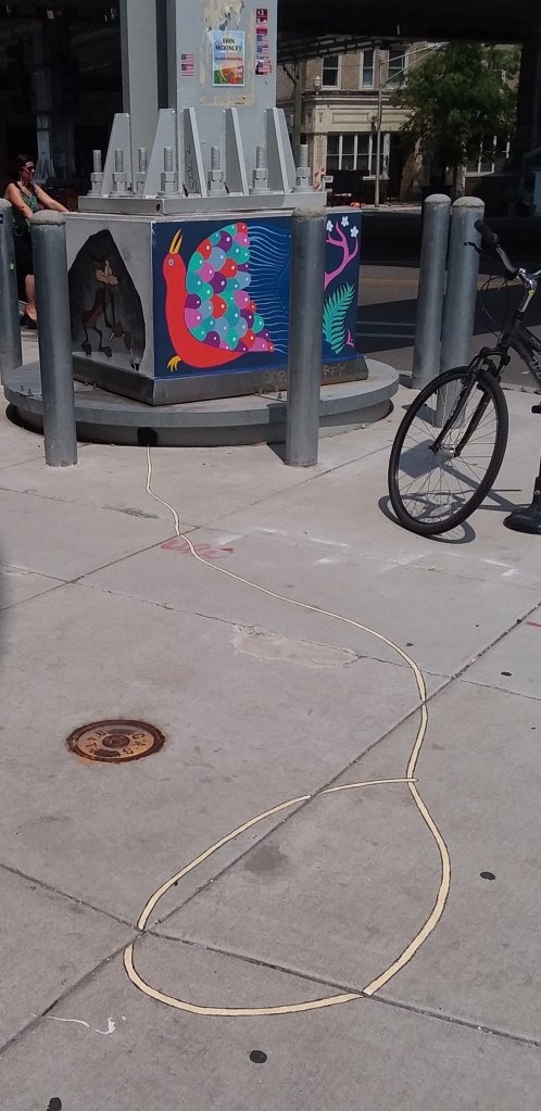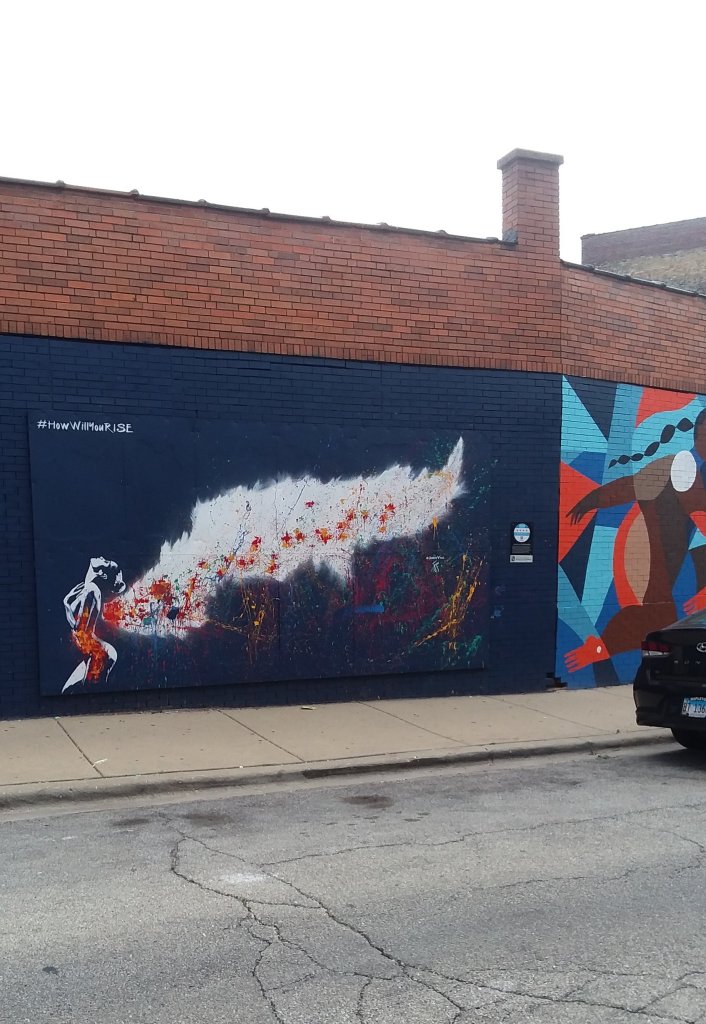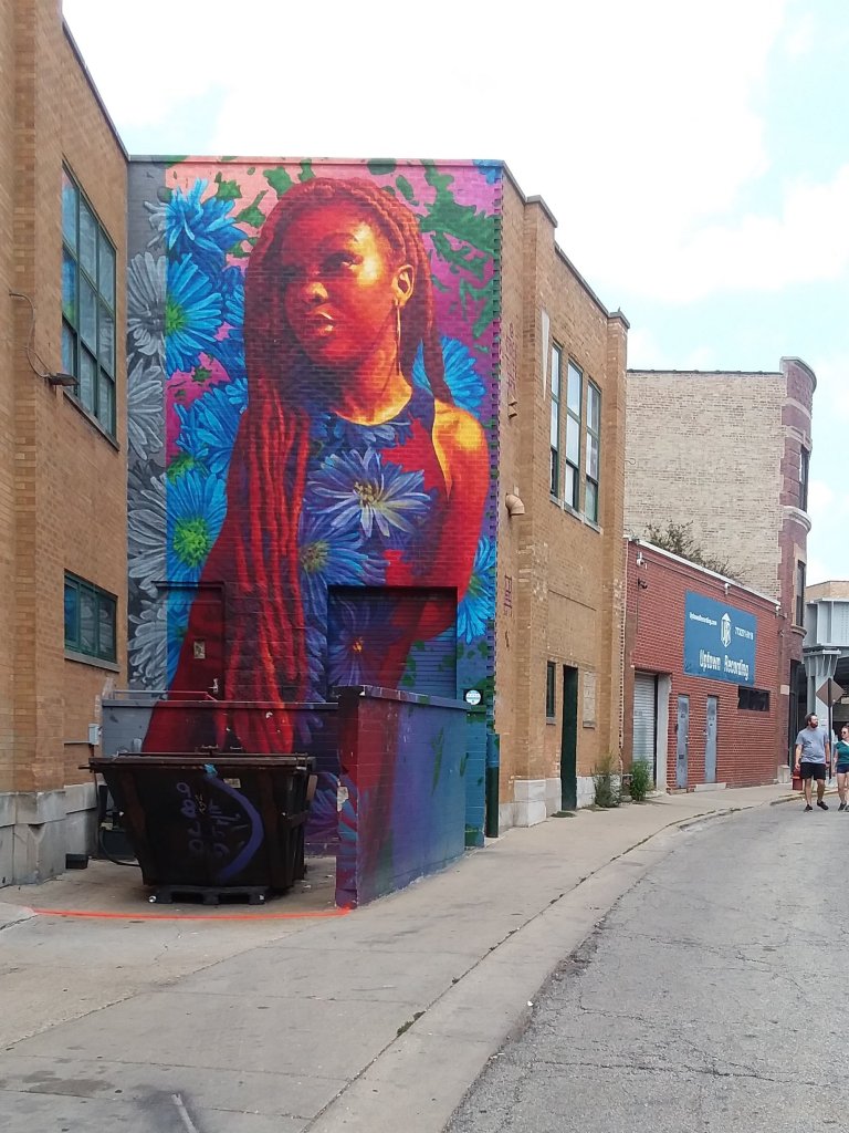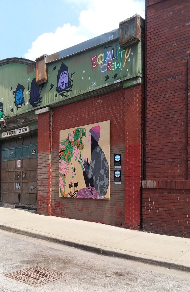 Chicago is a city of murals and after I snapped a picture of one of my favorites downtown, I began realizing that there aren’t any murals in my immediate neighborhood but that there are lots in the next neighborhood to the north. And this week during Uptown Art Week over 40 more will be created. Yesterday we hopped on the bus to see some of them. After a quick walk through the Uptown Art Fair at the future Chicago Market food co-op we decided to check out the murals that were being painted on the Red Line columns. Turns out that it was the base of the columns that artists were invited to paint.