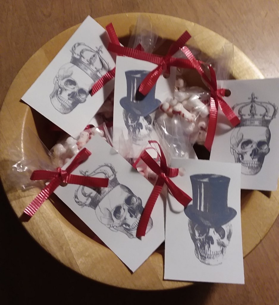 For my Halloween treats I used two images I downloaded from Ella Claire Inspired and paired them with bloody bones I found at Target. I wrote B-B-B-Bad on the back. When I gave them to people they usually exclaimed “To the Bone!”