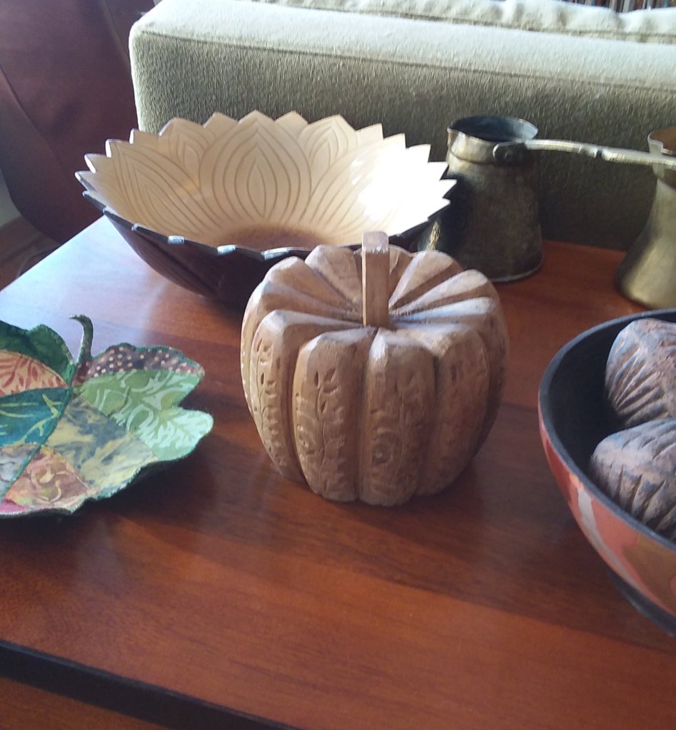 At the beginning of October I decorated the Halloween trees and put them in the dining room windows as I have been doing and I arranged the Fall and Halloween things on the shelves much as I did last year. I got a real wooden pumpkin at Home Goods so I donated my fake one and some of my other pumpkins.