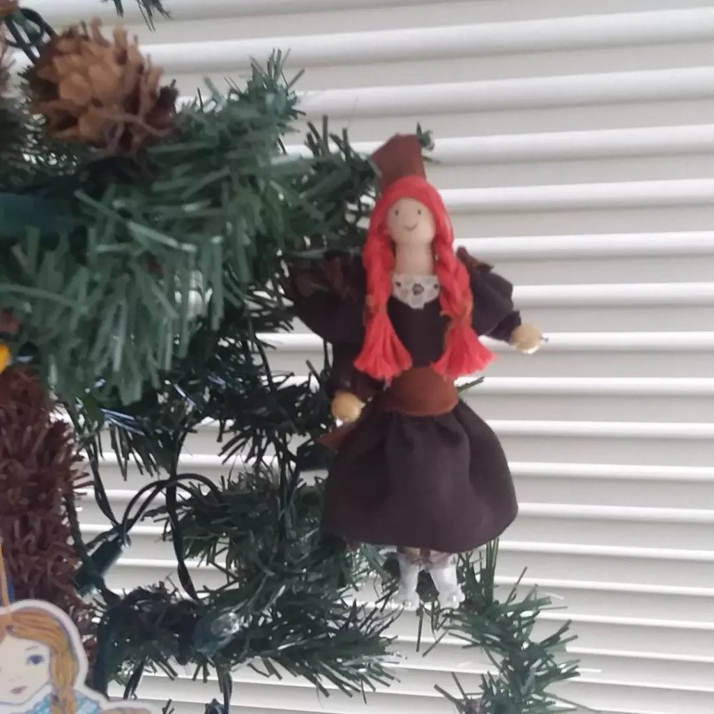 This year I noticed that several of the female characters on my children’s book and movie characters tree were redheads (even Madeline seems to be a redhead now). I also realized that the most important redhead was missing and I decided I needed an Anne of Green Gables ornament. I looked to see if there were any available online but then decided to make my own and ordered a package of clothespins instead. None of the ornaments and images of Anne online seemed quite right. Frankly the calico dresses with pinafores said Little House on the Prairie not Anne of Green Gables to me. I thought it was only right to give my Anne ornament the puffed sleeve dress that Matthew had Mrs. Lynde make as a Christmas present for Anne.