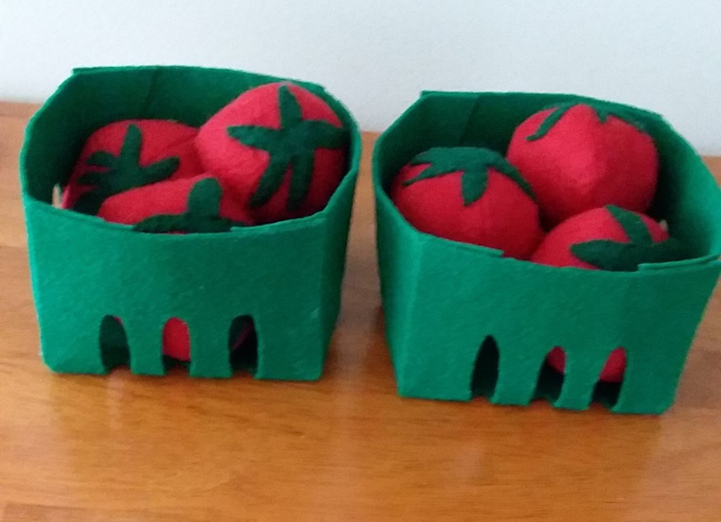Since my grandnieces like balls so much I wanted to make them another type of food that they could also use as balls for their birthday. After thinking about strawberries for a bit I realized that tomatoes were a better option. I found a felt tomato pattern that used 4 pointy egg shape pieces. My first attempt came out looking more square than round but adding another section solved that problem. I made them three tomatoes each and also made some produce baskets out of stiffened green felt.