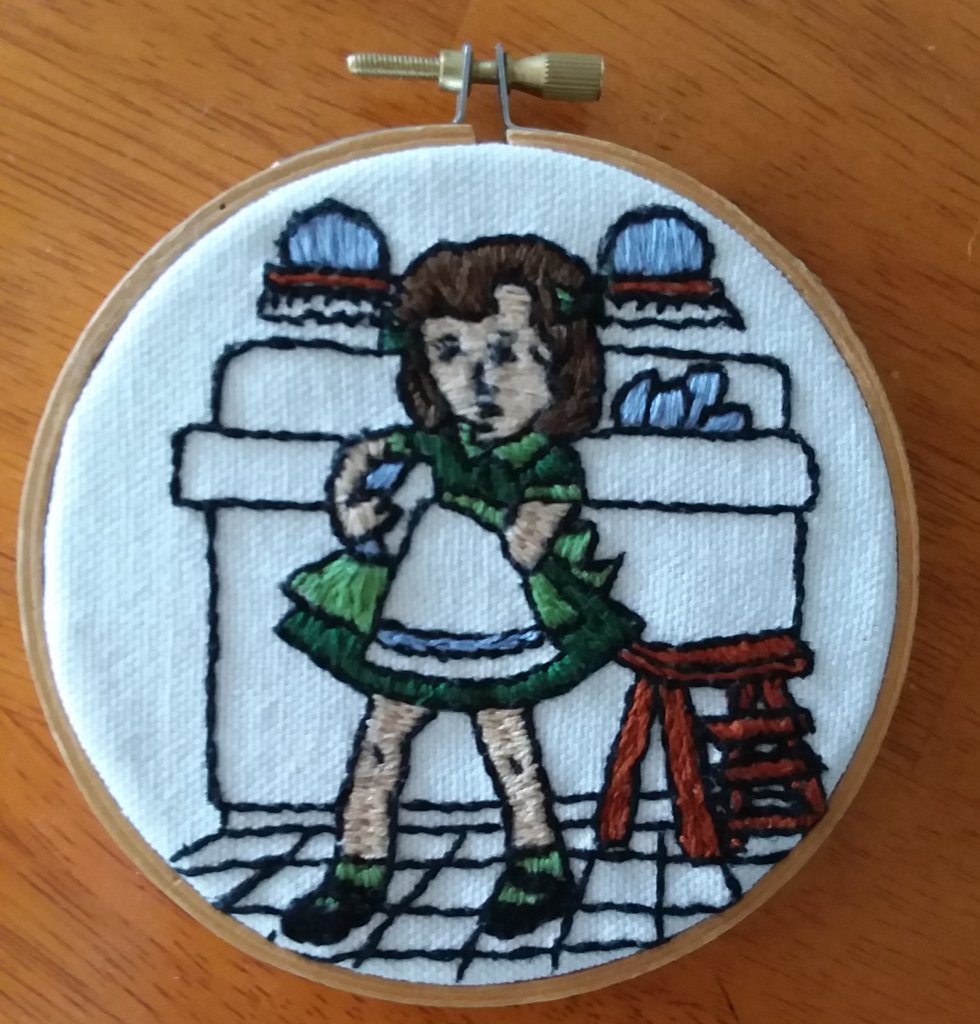 I found this little girl and with Henry Darger in mind, I thought she would be perfect. I had some challenges transferring the image to my fabric. This time I just traced directly onto the fabric but since I don’t have a light table I have to use the window and it is challenging. Getting her face right was quite difficult but I finally had to accept that I had done the best I could and as long as I don’t compare her to the original I’m pretty happy with it.