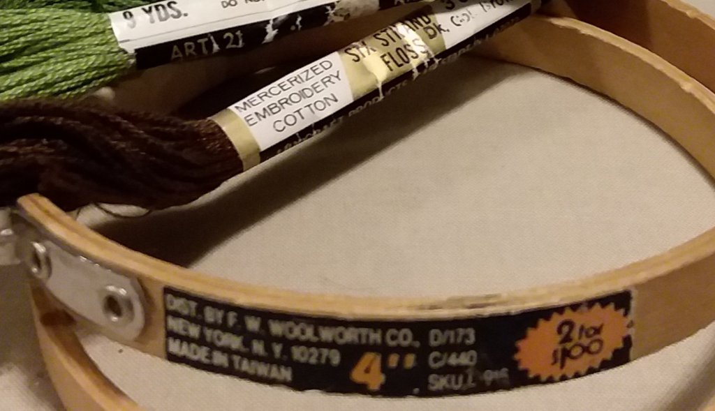 Several years ago a friend gave me some old embroidery supplies that I think belonged to her mother. I started using them when I began doing hoop embroidery last year and in the middle of embroidering my Stitchtober fairy tale piece the inner part of the vintage embroidery hoop broke. I would have just thrown it out except that it had a vintage label on it from F.W. Woolworth’s that included the price – two for a dollar – and the country of origin – Taiwan.