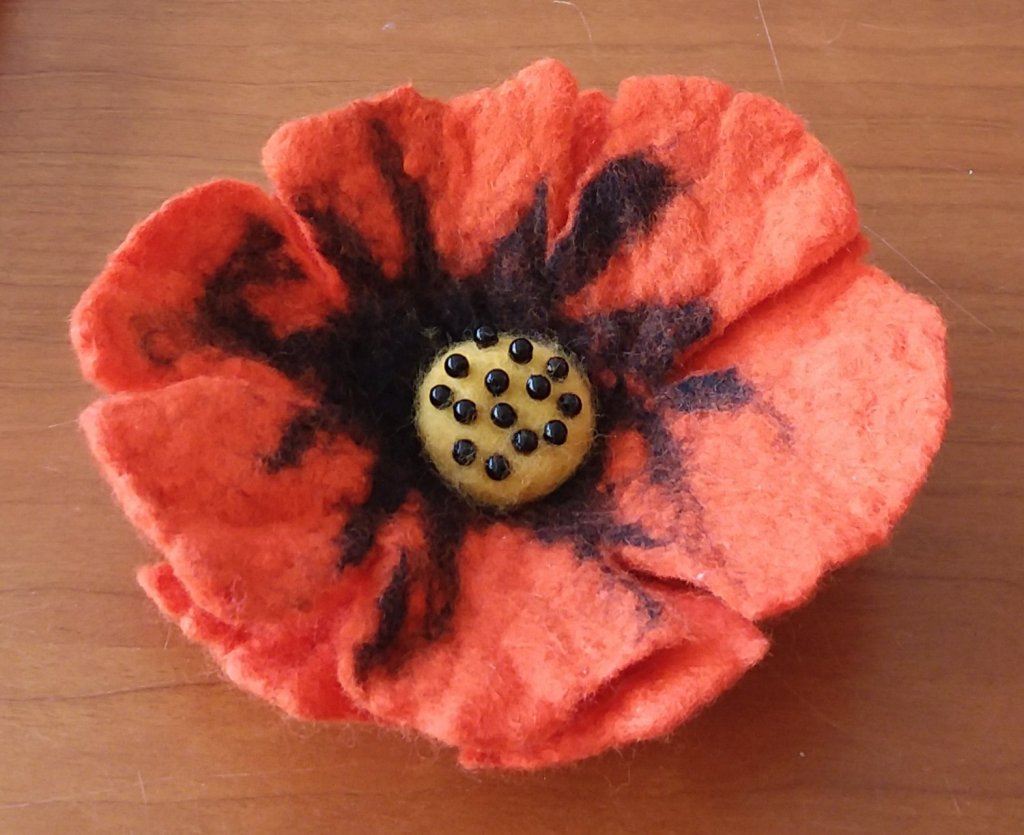 I was almost finished with her when I had to stop to take a road trip to go to a wet felting class with Dawn Edwards I had signed up for with my felting friend. We could have taken a weekend long hat felting class but since our first foray into wet felting had been with the master hat felter Beth Beede, we opted for the Friday Flower felting. We were imagining flowers with stems and while Dawn did show us how to do that, the main focus of the class was on flower embellishments. I made most of a poppy at the class and when I got home after I finished the embroidery, I needlefelted a center for the poppy and added some beads for seeds. I think I’m going to attach it to a headband and turn it into a sort of fascinator.