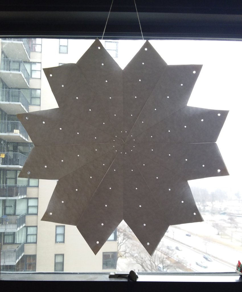I got a late start on this year’s window decorations since I was still working on my Stitchtober piece in November (it’s still not done…). I had seen some stars created by The House That Lars Built using a Cricut but since I don’t have or want one, I didn’t want to buy the template which meant I had to figure it out myself. I ended up with 12 pointed stars which is less than the originals but they worked and I liked the way they looked. I had a progressive size hole puncher so I decided to make a line of holes on each point starting larger and getting smaller at the center. Each star has two sides and I started out making holes on both sides. The hole puncher broke before I finished the last star but luckily I hadn’t put the penultimate one together so the last two have plain backs which is actually fine since they get the same amount of light shining through and you can’t see the holes from the street anyway.