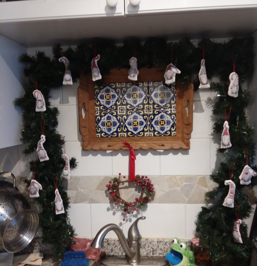 The kitchen “window” decorations were also inspired by The House That Lars Built. This year’s Instagram #larscraftalong Heirloom Ornaments involved printing photos on fabric and then embellishing them with embroidery and stuffing them. It also involved ornaments made by famous people who do a live crafting session on Instagram. Mary Engelbreit was one of the crafters this year and rather than embroidering on a photo she was embroidering a drawing she had made of a snow person which gave me the idea of using gnomes. So I googled gnome drawings, found some cute ones, and figured out a way to save and print them. I embroidered them with red thread and then backed them with red fabric.