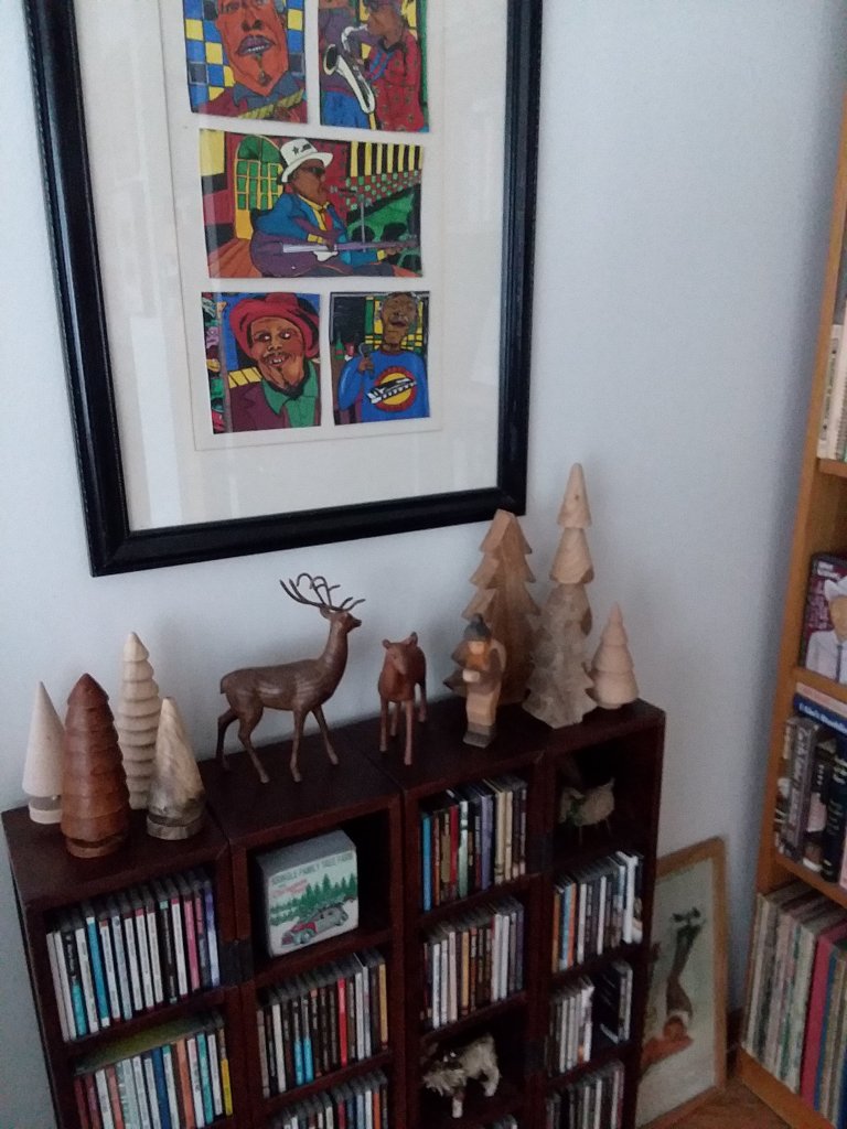 I got two new wooden trees this year so 8 had four foe each side of the “wooden” deer on top of the small CD bookcase.