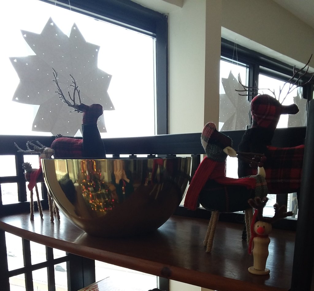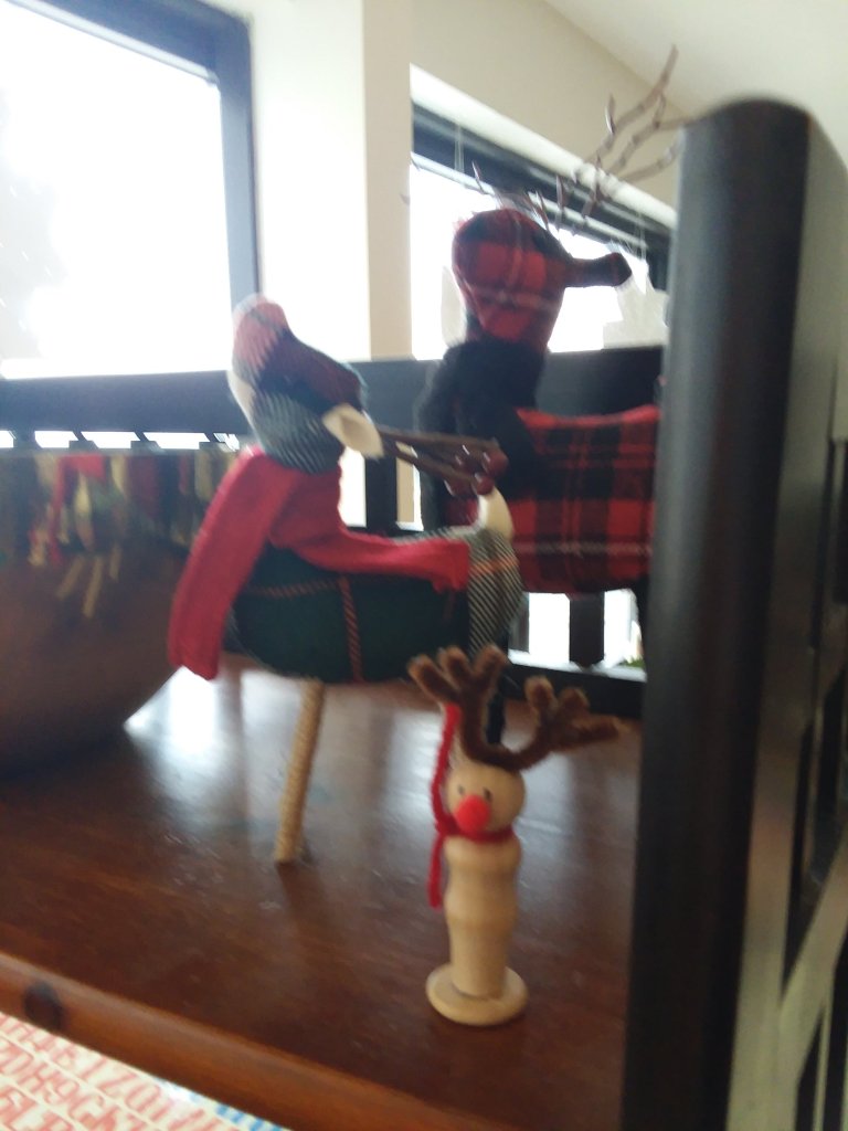 For the most part the Christmas decorations landed in the same places this year – snowpeople and Santas on top of the speakers, gnomes on the white book shelves, Christmas villages on the small bookshelf, and nativity scenes on top of the china cabinet. The deer moved about a bit, though. The plaid deer found a new home on top of the new bookcase.