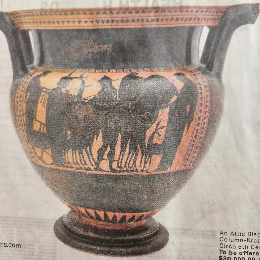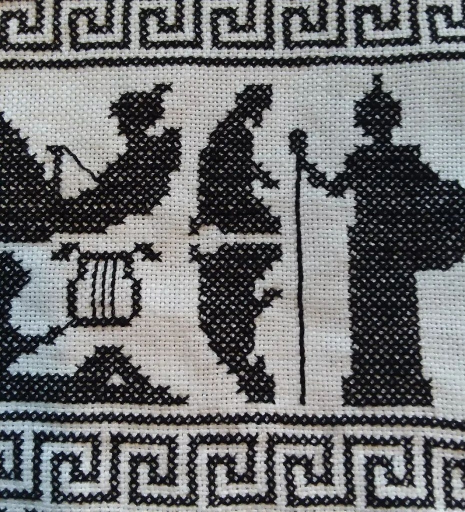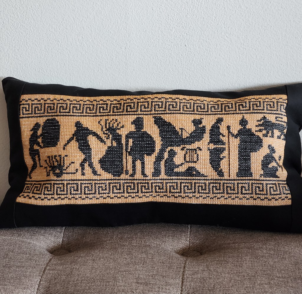 I had so much fun participating in the Instagram Stitchtober challenge in 2021 that I knew I wanted to do it again in 2022. I also knew I wanted to stitch one piece again but in cross stitch this year. Unlike the year before, when I thought of fairy tales as soon as I read the list, nothing came to mind this year. I didn’t even know what one of the words meant, but when I looked it up, everything fell into place. Ichor, it turns out, refers to the blood of the Greek gods. I realized that several other prompts also made me think of Greek myths – Unending made me think of Sisyphus, Reflect of Narcissus, and Beneath of Persephone. Obviously, the final prompt All Hallows had nothing to do with Greek myths, and as I researched Greek myths, I realized it would be difficult to stretch any myth to fit Black as Night. Luckily, though, I had come across images of Greek vases, and I decided to base my design on those and to have the first and last prompts refer to the thread colors.
