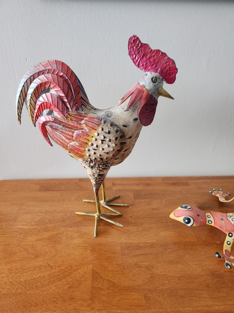 I love that his cockscomb is made from a plastic fork. Some other chickens have migrated to this shelf as well. The glass one on the right had been in an Easter basket one year, and I think the little Loteria card matchbox on the right is one from one of my husband’s Christmas stockings.