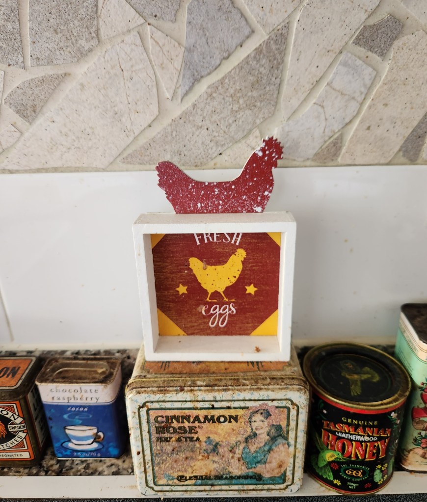 This chicken, an original painting gifted by our oldest daughter to her father, is in the rear of the middle box: