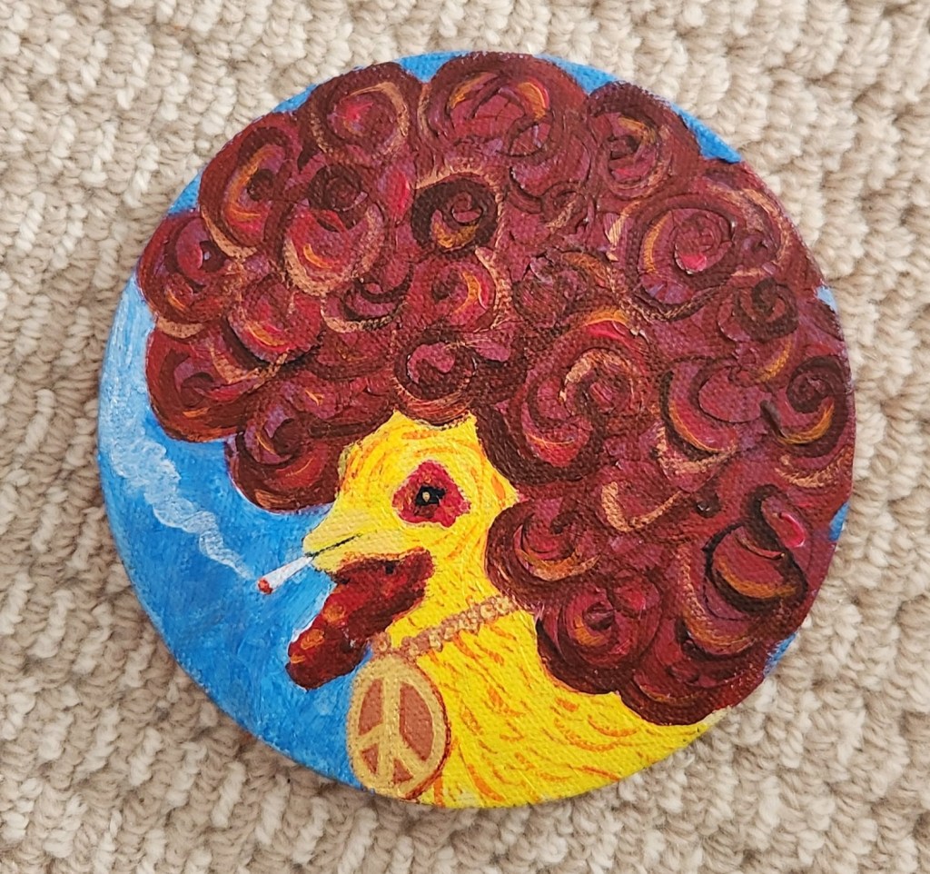That box also contains a chicken I bought thinking of it more as part of a collection of our art made of discarded materials (the body is made of recycled plastic bags) than of the fact that it was a chicken but since it was a chicken it ended up in front of the painting. For a long time, I couldn’t remember where I bought him, but then I saw a basket of them at a Sidewalk Sale at the Smith College Art Museum and realized he must have come from an earlier Sidewalk Sale.