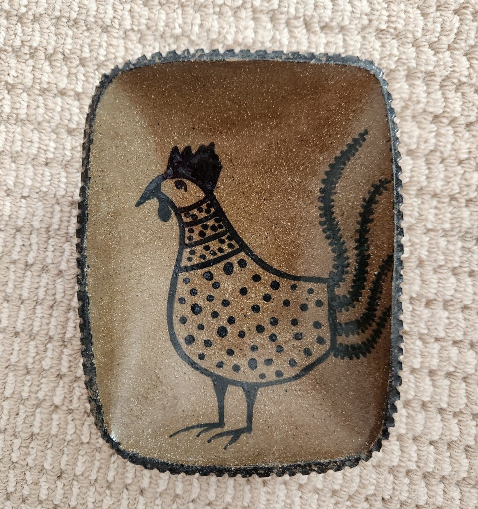I certainly never set out to collect chickens but it seems I have a chicken collection. My older daughter was probably the first to give us chickens. This rooster she gave me sat on top of our refrigerator in Northampton but now sits on her bench that became a part of our gallery wall.