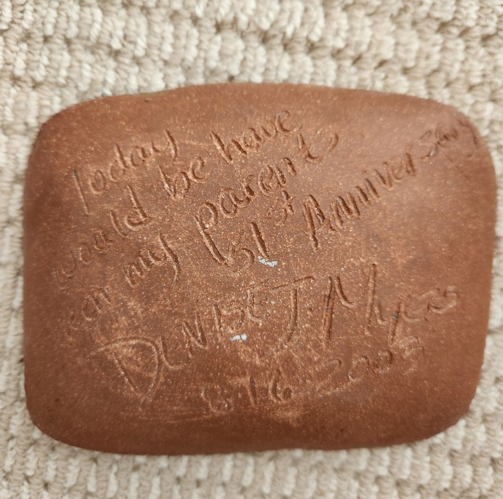 The back of it says, “Today would have been my parent’s 51st wedding anniversary Denise J. Myers 8-16-2003. Since August 16 is also the day my parents were married (in 1947), this plate had to come home with me.