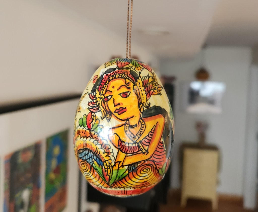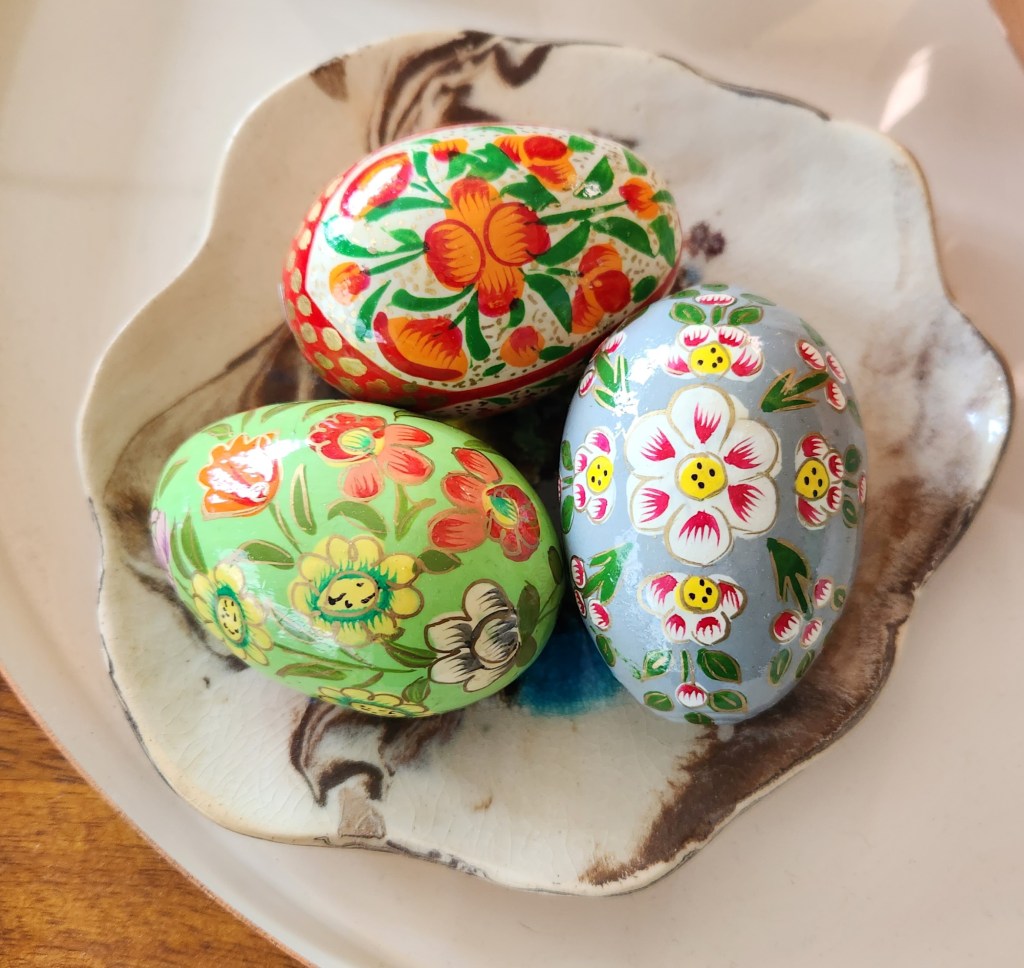 Then, my husband discovered that there was a Google feature on our new phones that enabled us to scan things and get more information about them. When he scanned our eggs, similar eggs popped up. Turns out these are Kashmiri eggs. Wooden eggs covered with paper mache made from recycled paper pulp and hand painted and then lacquered by artists in Kashmir, India.
