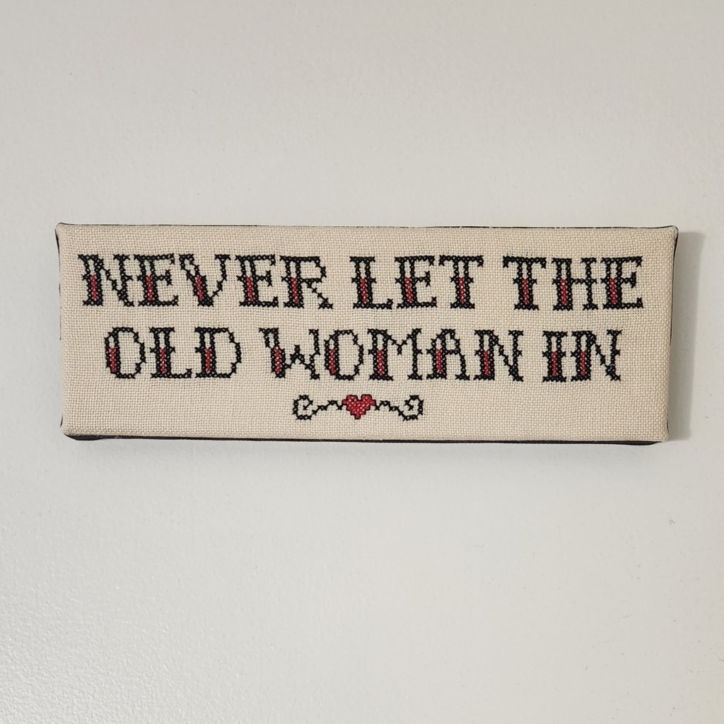 I didn’t know what I was going to stitch next, but a few days after I finished the tarot card, I read an article about Clint Eastwood. He was asked how he stays so productive at his age and he answered, “I never let the old man in.” I loved this sentiment and did some research on it. I found out that he has been saying it for years (sometimes saying “never” rather than “don’t”) and that he originally attributed it to an older man that he knew. It also turns out that after he said it to Toby Keith, he wrote a song based on it called. “Don’t let the old man in,” and it was included in the movie “The Mule.”