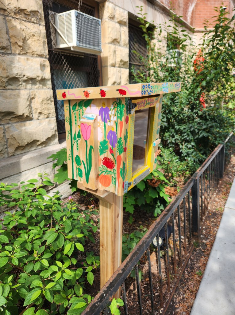 I wrote about the Nettlehorst Little Free Library before and mentioned that it was not visually distinctive, so I was pleasantly surprised today to see that it had been replaced with this beautiful one. Beautiful on both sides too.
