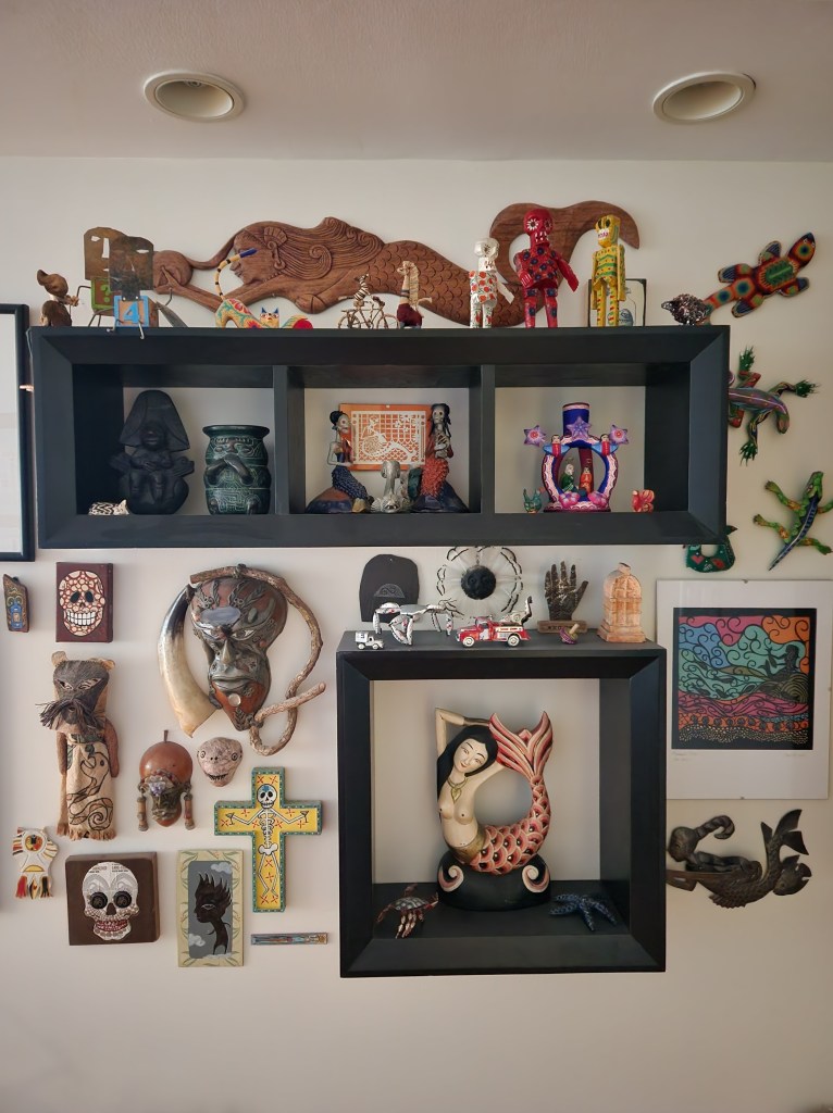 My husband gave me the red guy in the middle this year after purchasing him in Saugatuck this summer. Of course, he had to join the one to the left, who is also from Saugatuck and the one on the right we bought in Brattleboro. They were all made in Guatemala. I always thought of the yellow one which we bought first as more Zombie like than skeleton like, but the store in Saugatuck labeled the white one as a skeleton. Whichever, they look like they are planning something! Placing them together meant moving some other things around, and this is how that section of the gallery wall looks now.
