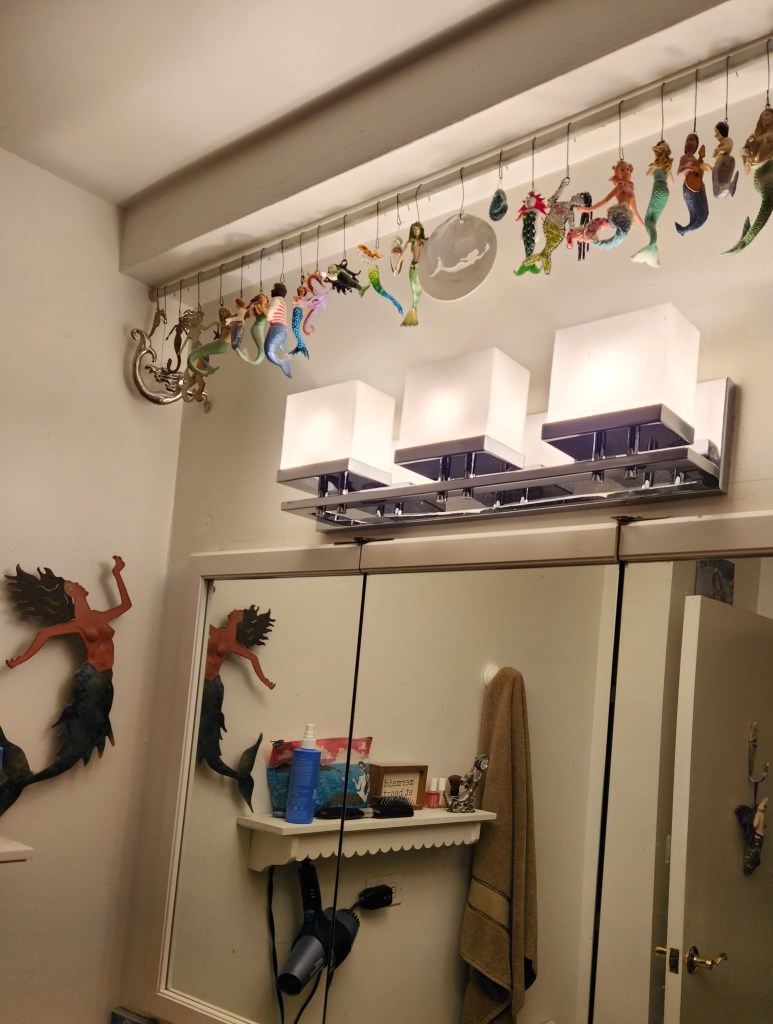 My Birmingham niece gave me a mermaid that joined some similar ones hanging above the mirror in the bathroom.