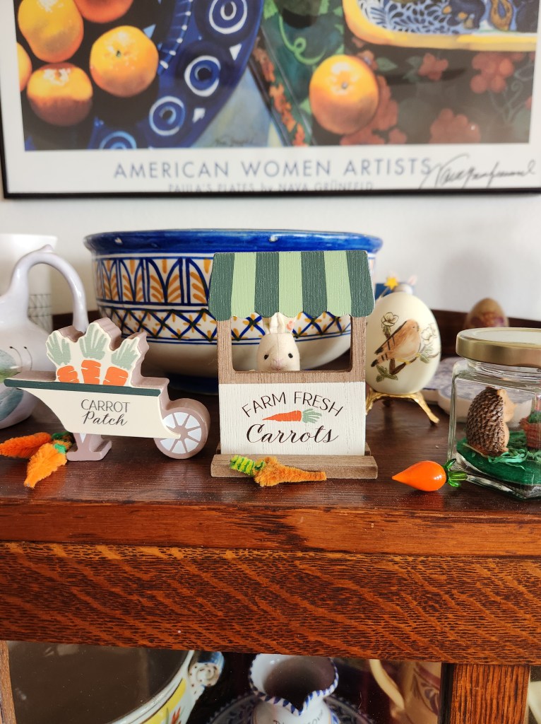 I couldn’t resist these wooden farm stand pieces when I saw them at Target’s Bull’s Eye Playground. I also couldn’t resist enhancing them with a bunny salesperson and some more carrots. “This is the cutest carrot I ever saw,” my oldest granddaughter said about the glass one. I’m not sure where we got it, but we’ve had it for a long time. The pipe cleaner one in front came with a pipe cleaner body antique paper bunny head figure (like the elves I made this year) but it seems I no longer have him. The carrots on the left went with some that I made but wasn’t satisfied with.