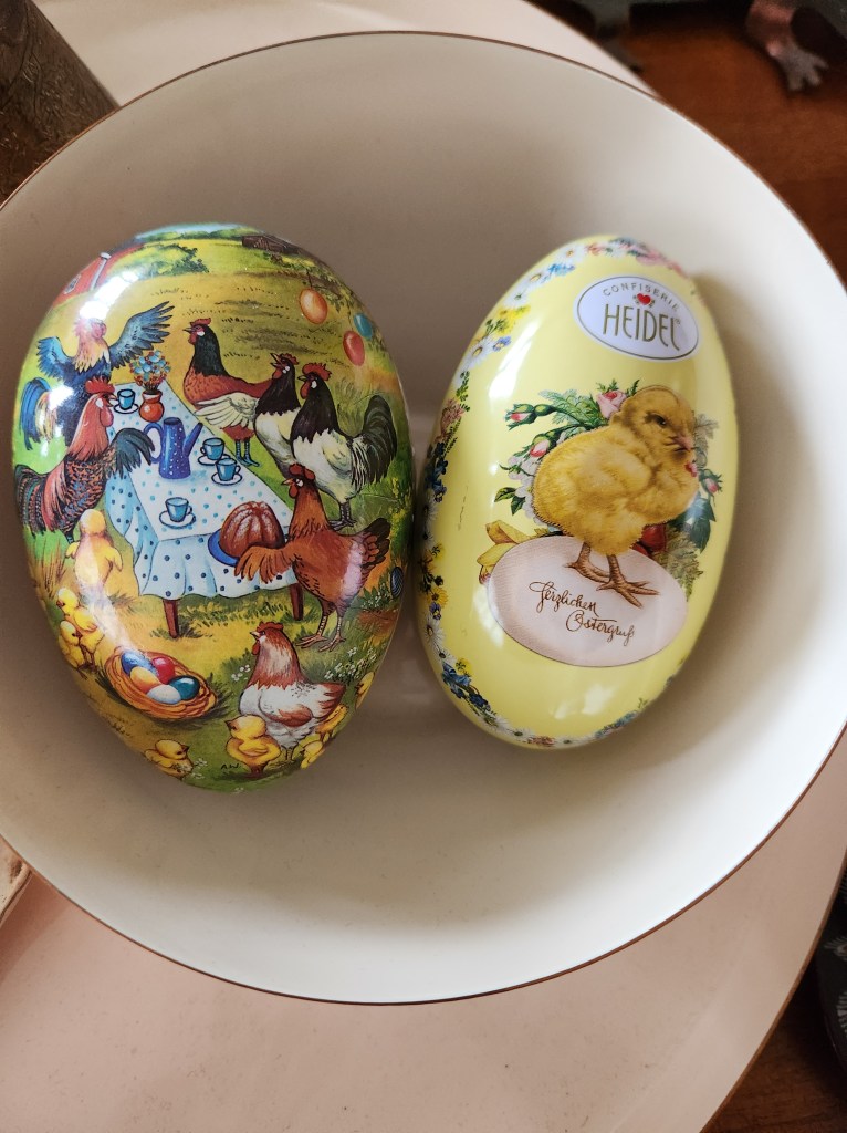 When I saw the Heidal egg tin filled with chocolate at Marshall’s, I bought it for my husband’s Easter basket, but I also imagined it paired with a vintage reproduction paper mache egg we already had. Here they are together – both sides work!