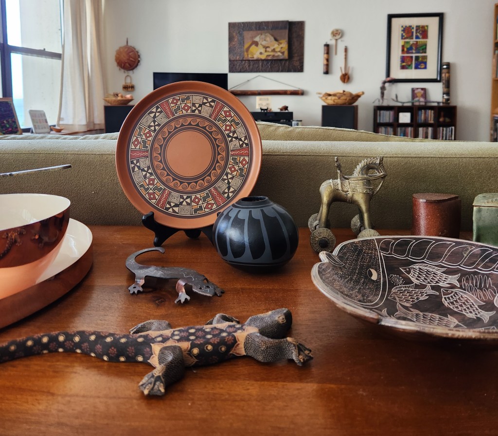 collecting, collections, decorating, folk art collection, gourds, martryoshkas, wooden mushrooms