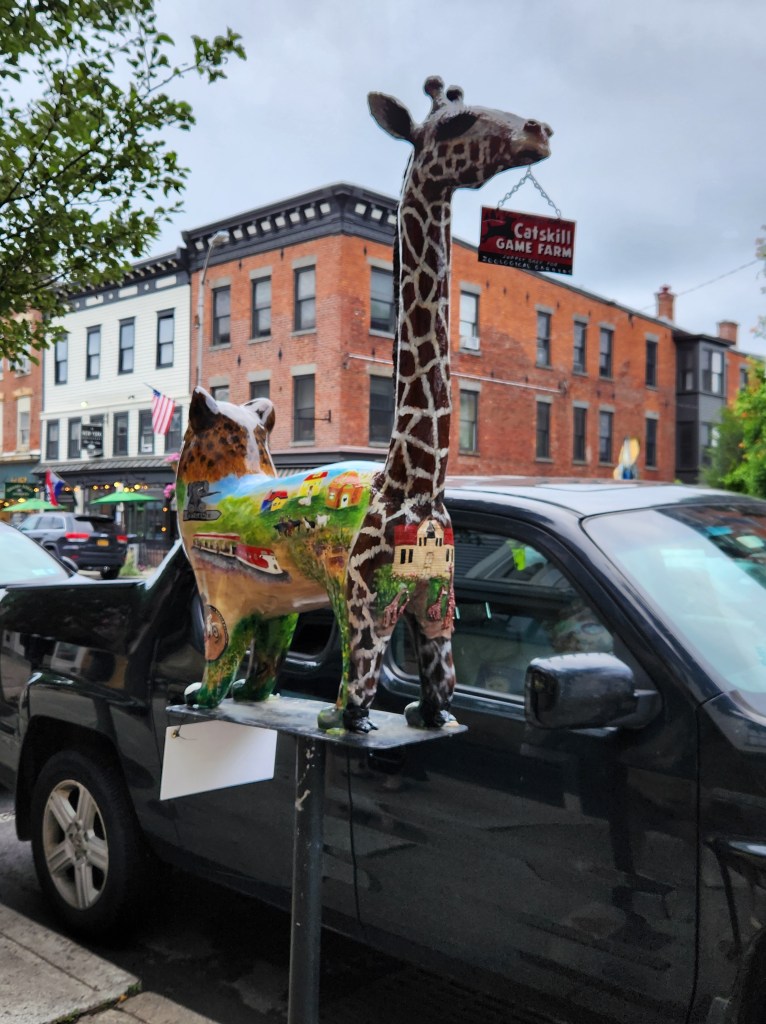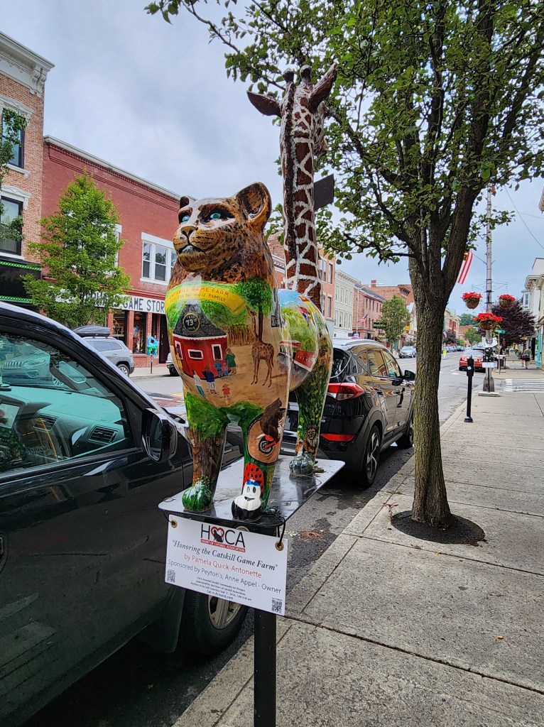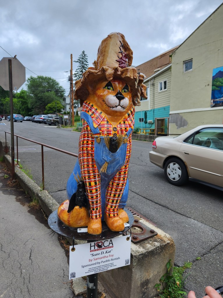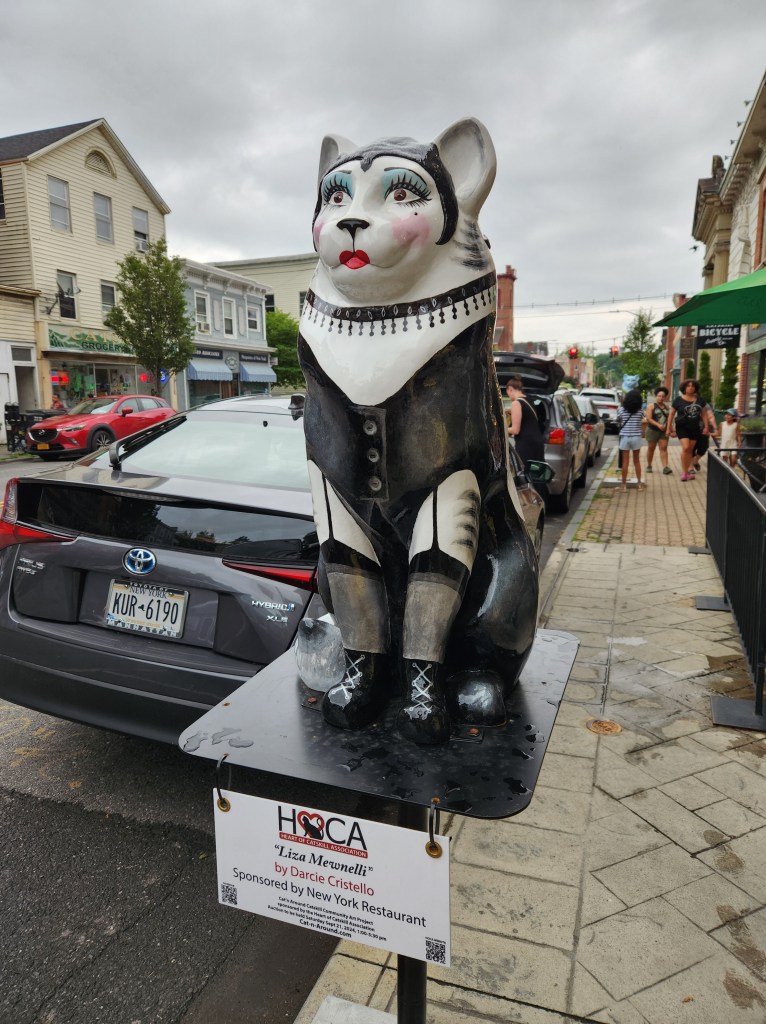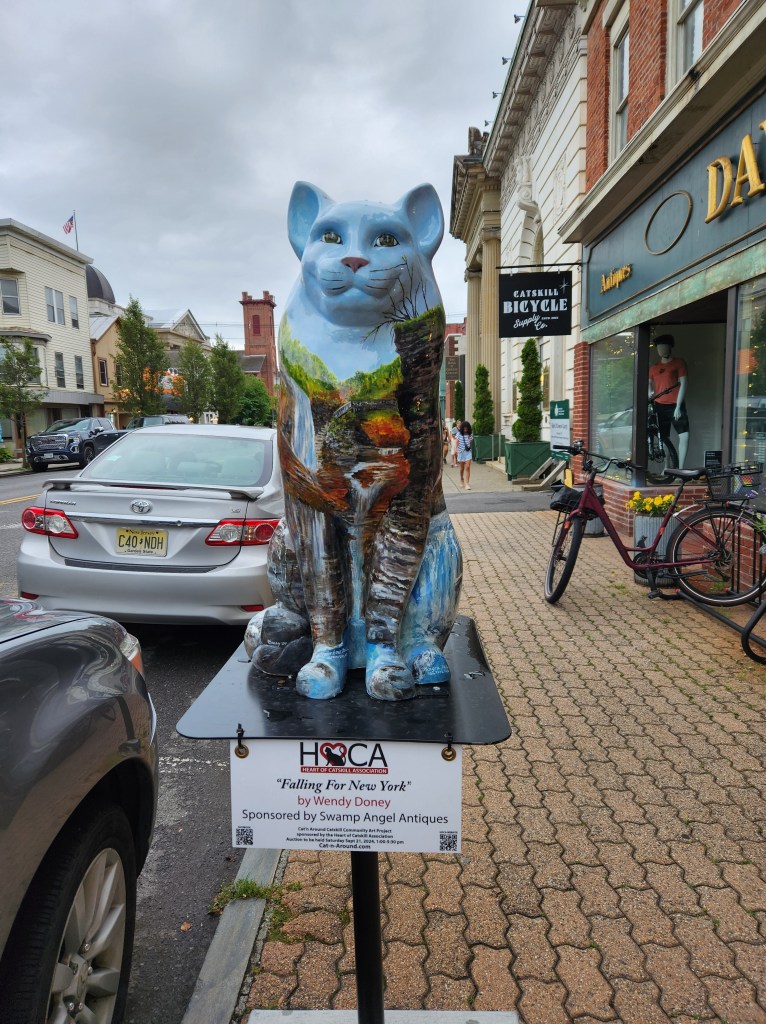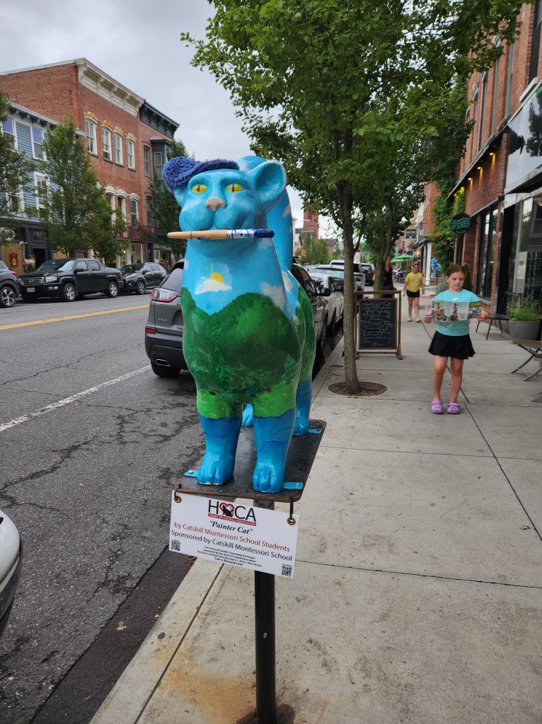 They don’t just do owls in Coxsackie (last post) they also do cats in Catskill, so while we were in New York we were glad to find out that we were going out to dinner in Catskill. We saw lots of them as we drove down the street to the restaurant, and when we got there, they said they needed a minute to set the table, so we grabbed a brochure and my youngest granddaughter set out to see how many we could “get.”