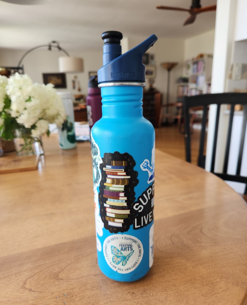 Since the water bottle was becoming a kind of catalog of things I like – art, music, mermaids – I thought it needed a book sticker, so I ordered one from @b.z.creations. That sticker below it from the Lakeview Festival of Arts held up extremely well. While I’m sad to let this water bottle go, I’m excited to see how my new one turns out!