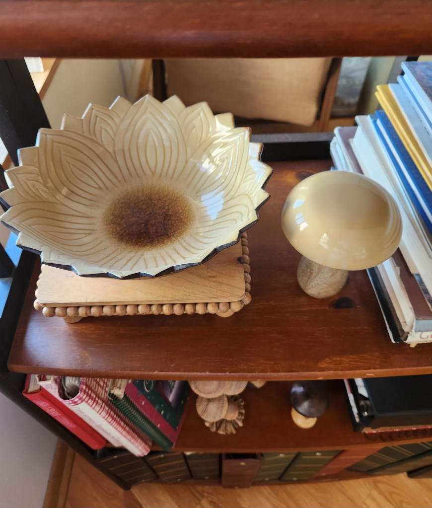 Lust, I thought, really? But I looked it up, and after I got past all the sexual references, I found the definition “intense desire for something.” That made me think of a recent experience involving my newest collection of wooden mushrooms. Since I found one wooden mushroom at Marshall’s, I feel almost compelled to return again and again and look for more. On one trip, I found one from India, but it had what I thought was an enamel coat over the cap so that only the stem looked wooden and like it belonged with the rest of my mushrooms. So I reluctantly left without it. But I pined for it or dare I say lusted for it and when I realized the enamel was the same color as the inside of the bowl on the shelf above the mushrooms, I returned to Marshall’s the next day and was relieved that it was still there.