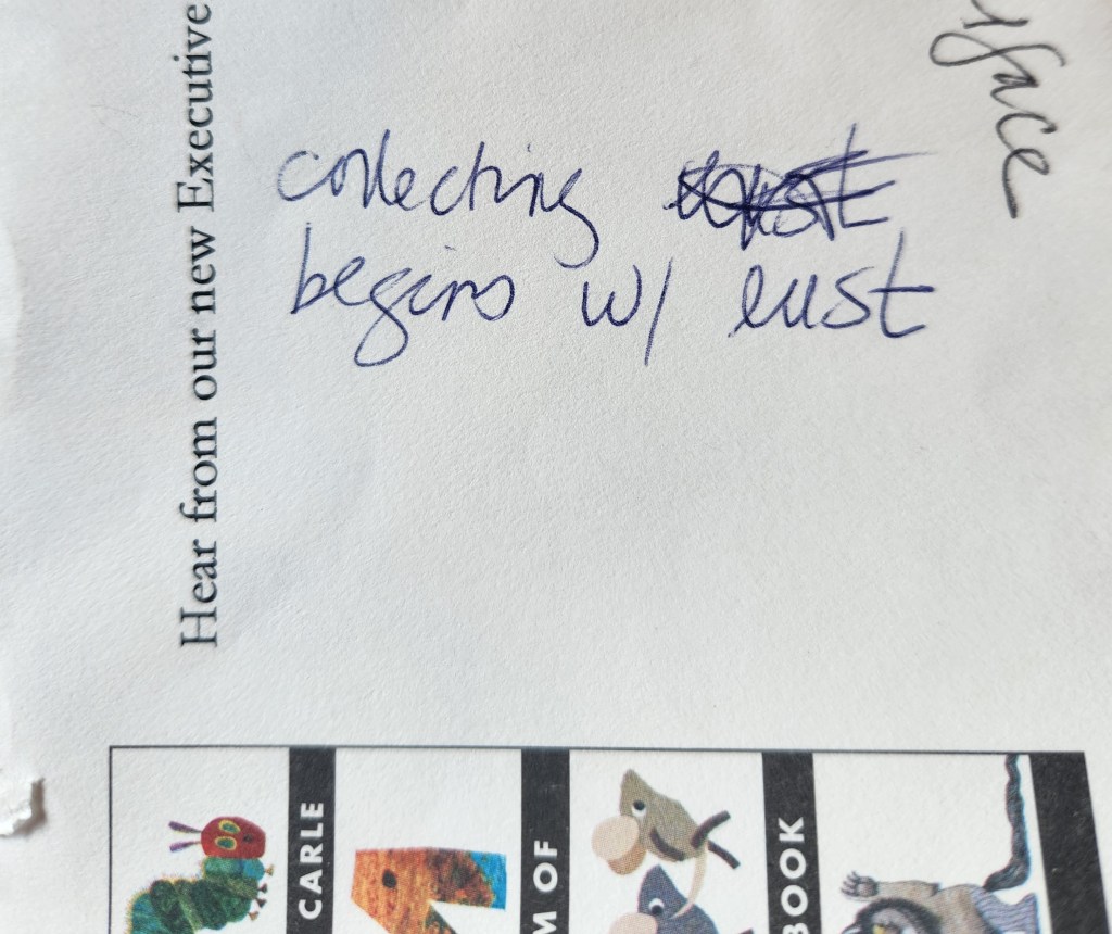 I have a tendency to write notes on envelopes and other random pieces of paper when the need to remember something strikes me. The other day, I was organizing a pile of things (another tendency) that I wanted to save and file, and I came across this envelope and the quote, “Collecting begins with lust.” I remembered that I wrote this during one of the Intuit collector tours, and based on other evidence on the envelope, I concluded it was from last December and that Doug Bristol was the quoted collector.
