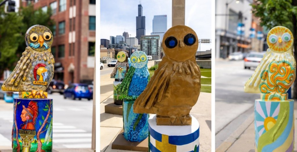 Recently my youngest granddaughter asked if we could do that owl thing again by which I guess she meant go back to Coxsackie, NY, over a 12 hour drive away, to look at the artist painted owls and check them off on the brochure. Luckily, when I was on the bus going to a weaving workshop at the Hull House, I spied some painted owls out the window as we rode through Greek town.