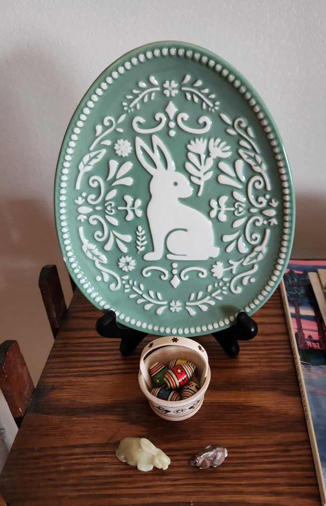 All the decorations ended up in the same places again this year except these two little bunnies who are perched in front of the little basket of eggs we got at the Ukranian National Museum. We stopped there when we went to see the Ukranian churches during Open House Chicago this year. I bought the bunny plate at the Walmart in Columbia – speaking of places that are much better than the last time I went to one!