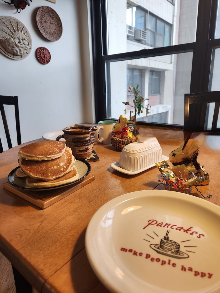 We had pancakes with our Easter baskets since Easter was on a Sunday and we weren’t having a brunch this year. My tiny Easter “basket” isn’t really visible in that picture but here’s where I put it on the sideboard after I ate the delicious Ghirardelli chocolate caramel bunnies out of it.