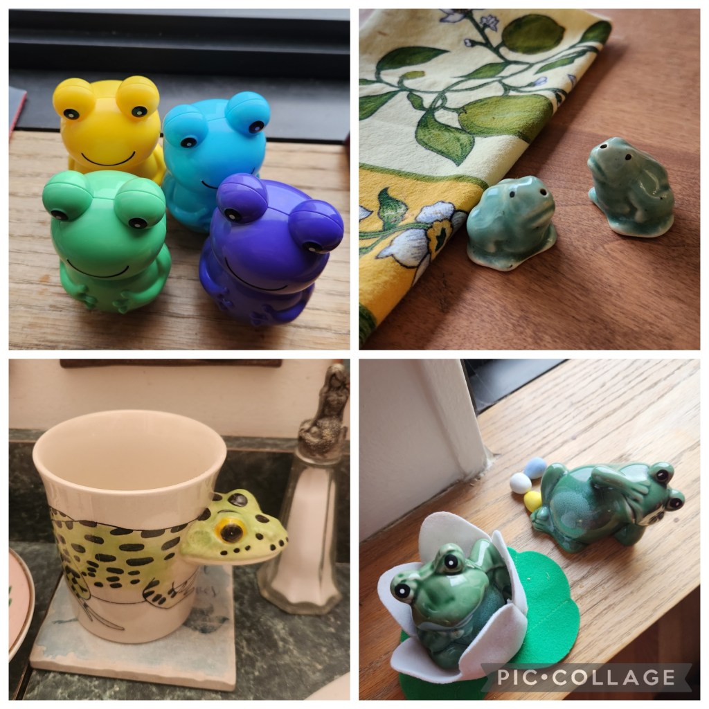 Spring started with the traditional frog appearances. Those colorful frogs full of Cadbury mini eggs started things off. They were followed by the two vintage salt and pepper shakers from Inkling and the incredible frog cup I bought in Saugatuck last summer. On the first day of Spring all the frogs around the house gave birth to Cadbury mini eggs – a few are visible in the fourth picture.