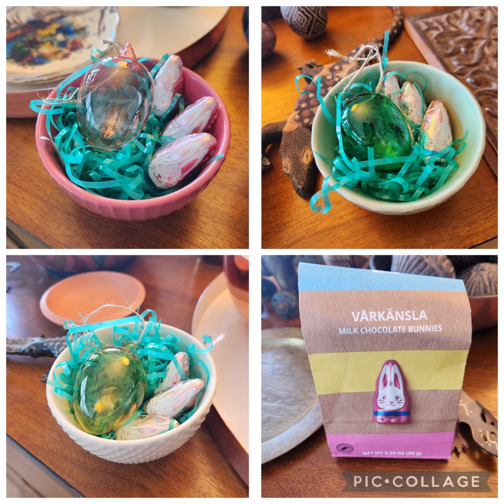 We went to Ikea recently to buy a new bedside table light. It was only my second visit to an IKEA and it was so much nicer than I remember the first one being. I loved a set of three little bowls and another set of three glass eggs and thought they’d be perfect for my daughter’s and granddaughter’s Spring gifts.